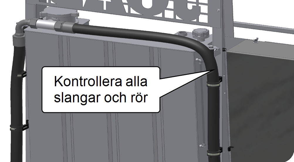 Kontrollera att inga slangar eller rör är i kläm. Kontrollera att slangar och rör är fria från skador och/eller läckage. -