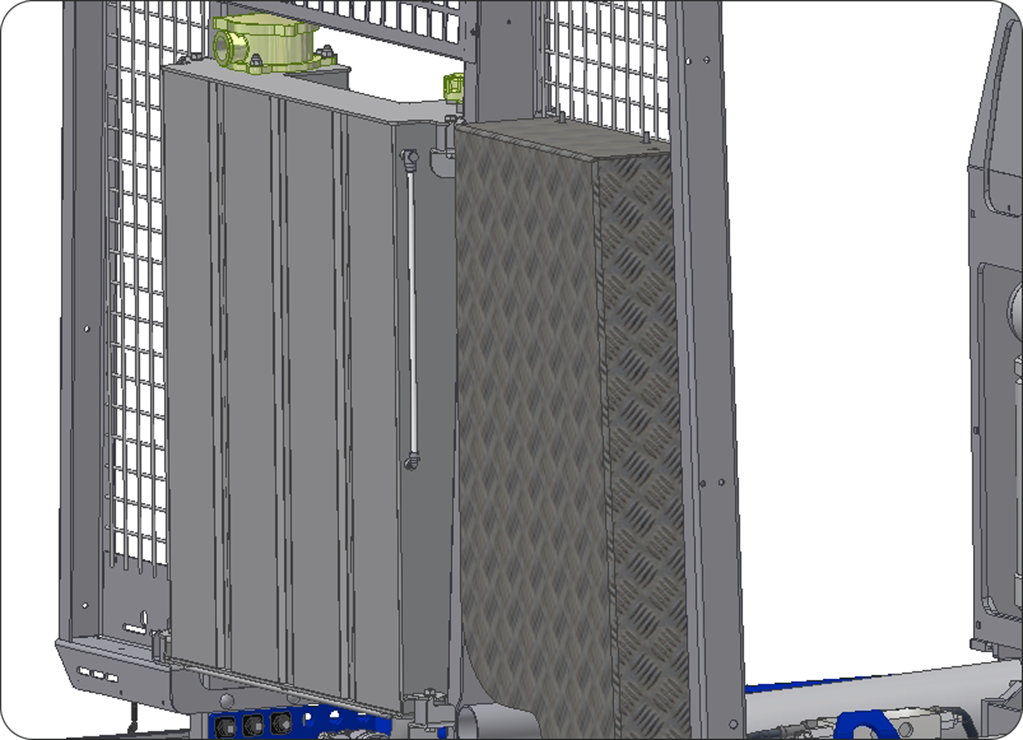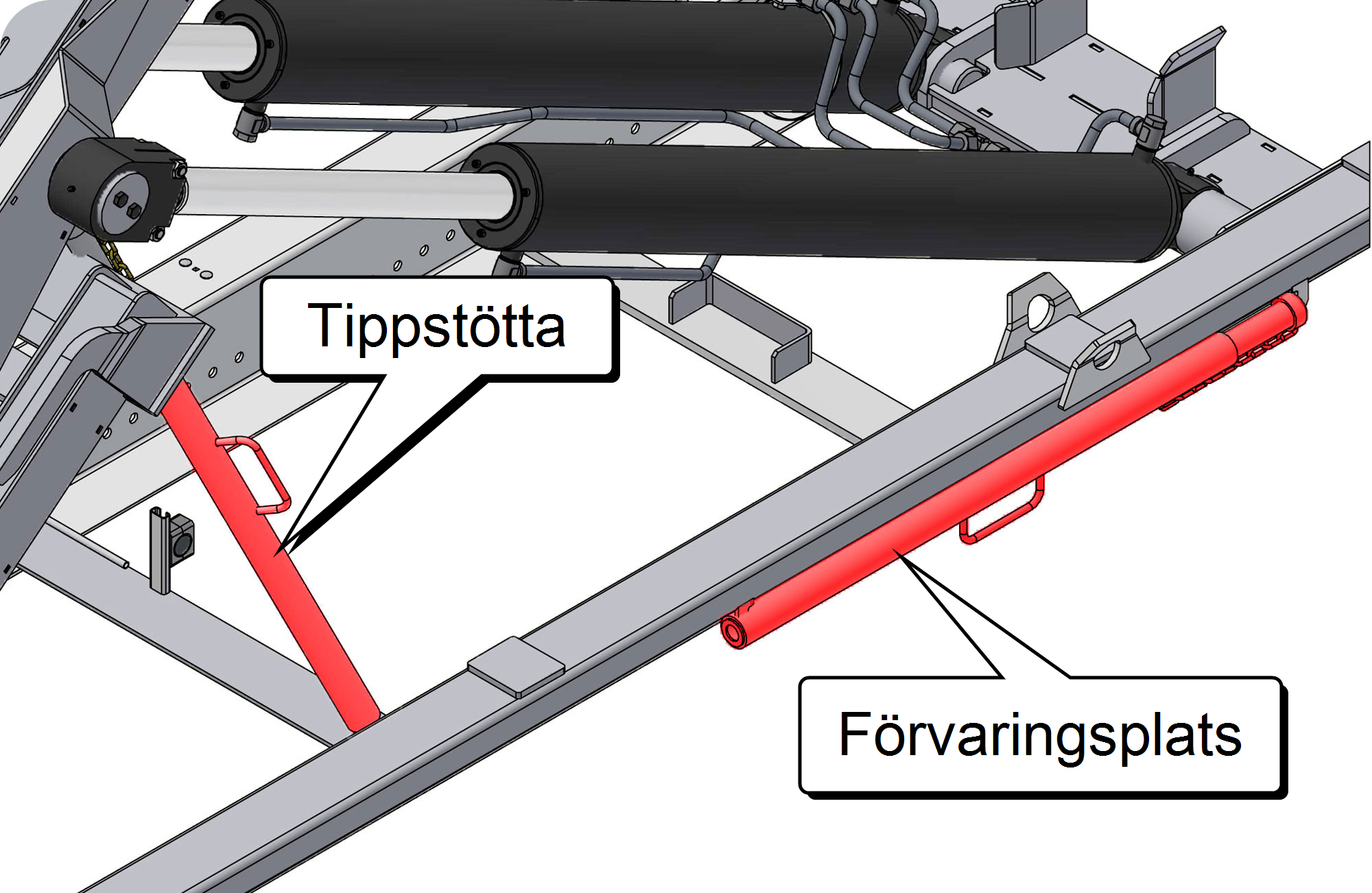 Vidstående bild visar var tippstöttan (röd) förvaras när den inte används. Den förvaras på hjälpramens utsida.