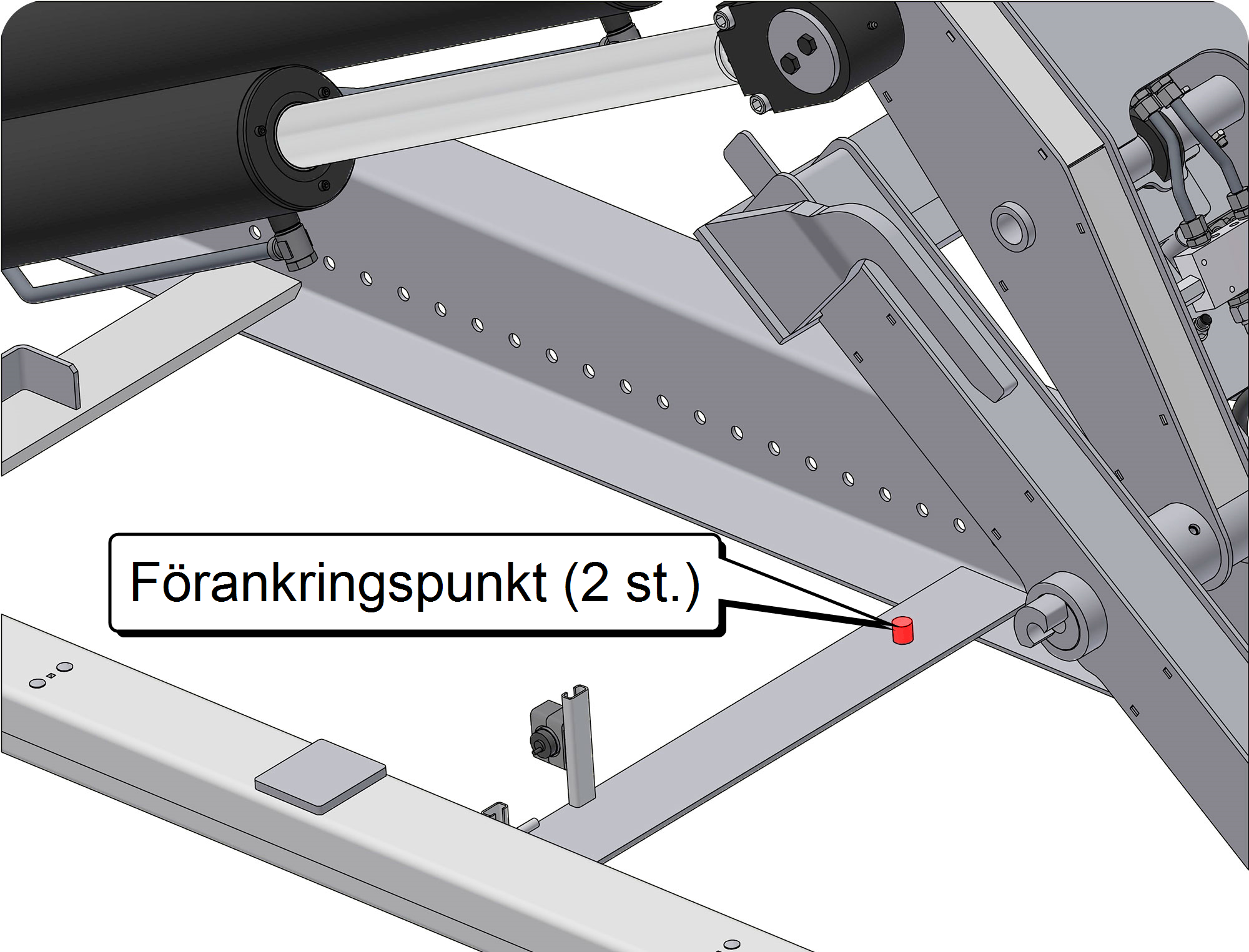 Tippstöttan ska förankras mellan hjälpramen och mellandelen med hjälp av två sprintar som förankringspunkter. Lokalisera förankringstapparna och placera tippstöttan mellan dem som bilden visar, innan arbete utförs på lastväxlaren.